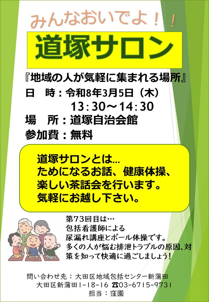 道塚サロン第73回は、包括支援センターの湊さまによる「尿漏れ講座とボール体操」でした。途中参加を含めて15名の皆さんが知恵熱と軽い汗をかきました。しっかりとした知識の裏つけと健康体操で体調を維持しましょう。皆さんに二日遅れの雛あられをお持ち帰りいただきました。