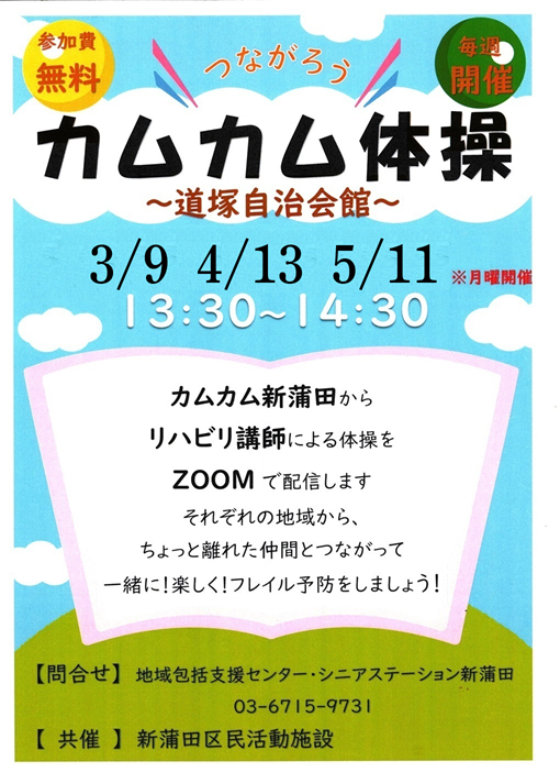 2025年度 カムカム体操(道塚自治会)3月9日開催 令和8年3月9日(月)13:30~14:30(道塚自治会館) リハビリ講師による健康体操を講師含めて1+約13会場でオンライン開催!! 風は昨日同様に冷たいですが比較的過ごしやすい一日でした。今日の参加は13名。一日一回は外出し外の空気を吸って、フレイル予防にカムカム体操!! 来月以降の開催日は上記チラシをご覧ください。 活動報告一覧はここをクリック
